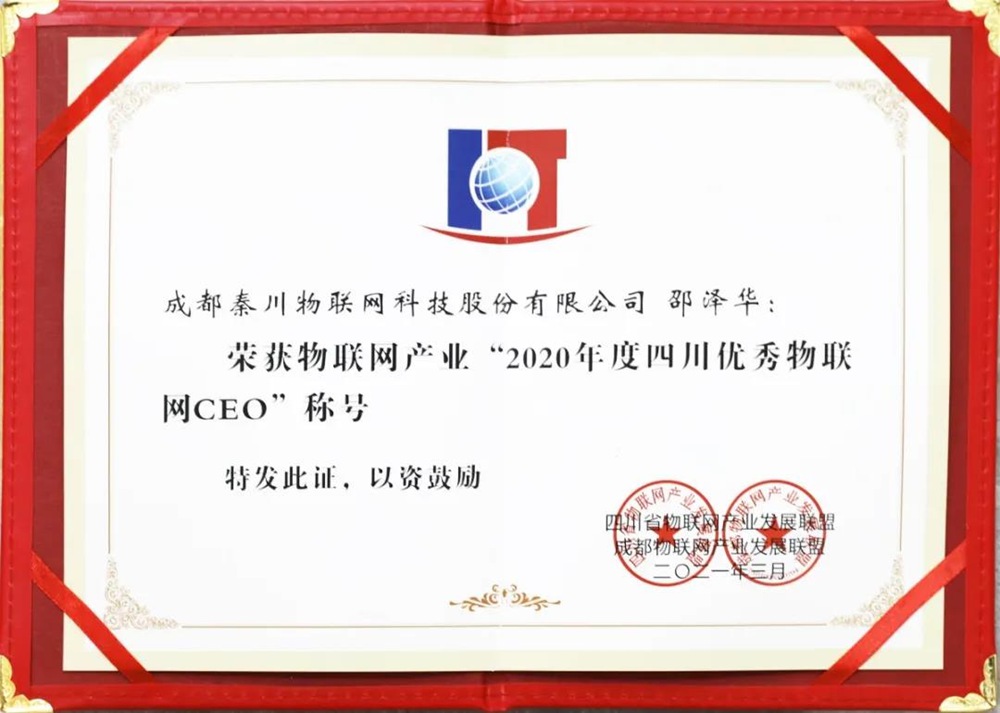 会上,港澳宝典免费资料(以下简称秦川物联网)董事长、总经理邵泽华先生荣获“2020年度四川优秀物联网CEO”称号,秦川物联网产品“NB物联网智能燃气表及其运行体系”被评为“2020年度优秀物联网产品”。